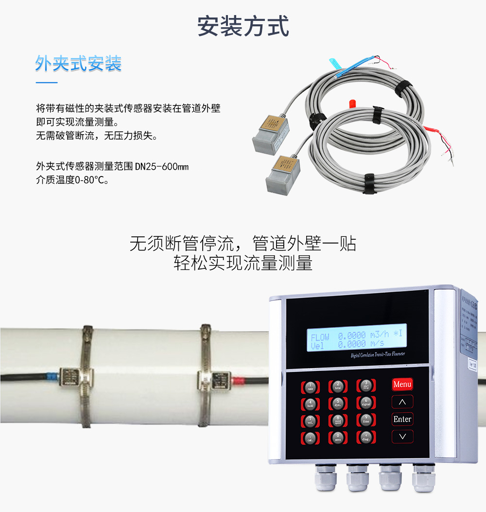 聯測超聲波流量計適合相對純凈液體流量的管外測量,尤其是在水流量測量、在工業循環水、空調制冷循環水、原水、高壓水、自來水,污水排放管等廣泛應用。CN6