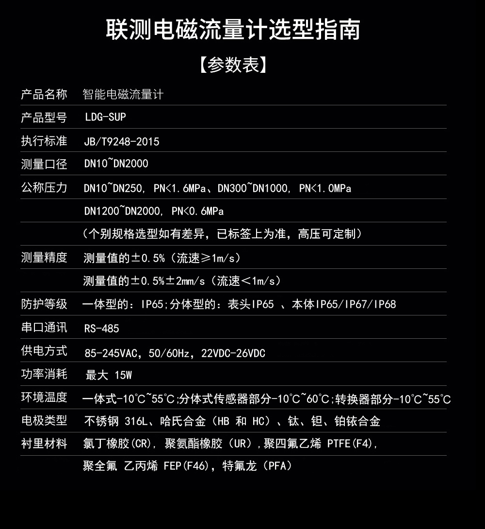 聯測LDG-SIN電磁流量計適用于化工助劑、海綿城市、給水排水、水利灌溉、水處理、污水處理(環保污水控制、化工污水、電鍍污水)、造紙漿液(紙漿)、泥漿、醫藥原料、食品等工農業的生產公司過程流量測量和控制,標配485通訊功能。