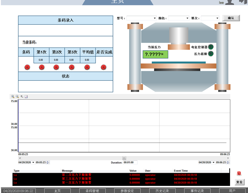 軟件工作流程 登陸系統:以管理員或者工程師權限登陸系統。 配置參數:設置最小壓力檢測值,壓力測試等待時間,第一步等待時長,條碼序列號長度,壓力超限值等等。 配置條形碼的組成元素:條形由車型,顏色,班次和日期等因素組成,管理員需要配置這些信息。 掃碼執行壓力檢測:用戶需要在首頁掃描框中,掃入條碼,系統自動執行平整度檢測。飼服電缸頂端3次按壓檢測部位,測試每次壓力值。 查詢檢測結果:檢測完成后,用戶可以直接在首頁查看檢測結果。 打印報表:用戶可以查詢指定日期范圍內的檢測數據,導出PDF報表。