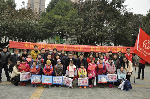 奧園集團以“打造常青基業(yè),構(gòu)筑健康生活”為企業(yè)愿景,積極踐行企業(yè)社會責(zé)任,熱心各類公益活動。為了響應(yīng)黨中央精準扶貧戰(zhàn)略部署, 奧園集團黨委發(fā)起成立了奧園慈善基金會,以“愛心你我,傳遞溫暖”為宗旨,實施“雙十雙百” 精準扶貧工程、助學(xué)支教、賑災(zāi)救濟、社會援助、體育健康等公益事業(yè)。每年持續(xù)精準對口扶貧十個貧困村、十所貧困學(xué)校、一百戶困難家庭、一百名貧困學(xué)生。