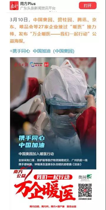 3月10日,中國奧園、騰訊、京東、唯品會等27家企業(yè)接過“暖醫(yī)”接力棒,相繼發(fā)布“萬企暖醫(yī)——我們一起行動(dòng)”公益海報(bào)。