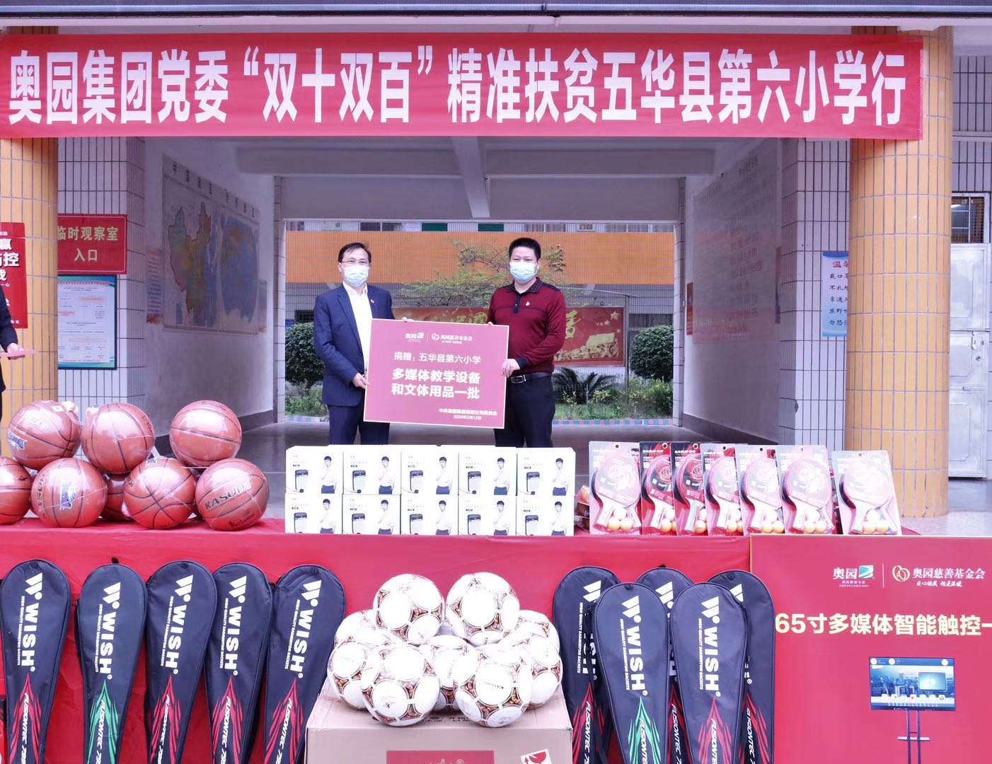 奧園集團(tuán)黨委,與五華縣水寨鎮(zhèn)壩美村、縣第六小學(xué)開展結(jié)對(duì)幫扶。幫助村民改善周邊生活環(huán)境,優(yōu)先安排村民在奧園廣場(chǎng)創(chuàng)業(yè)就業(yè),積極幫助解決“兩不愁三保障”問題,每年幫扶村里的貧困戶,捐贈(zèng)慰問金以及生活和防疫物資等。同時(shí)奧園集團(tuán)黨委攜手京師奧園南奧實(shí)驗(yàn)學(xué)校,每年與五華縣第六小學(xué)開展教育幫扶和教學(xué)交流活動(dòng),資助貧困學(xué)生,捐贈(zèng)教學(xué)設(shè)備、文體用品等。