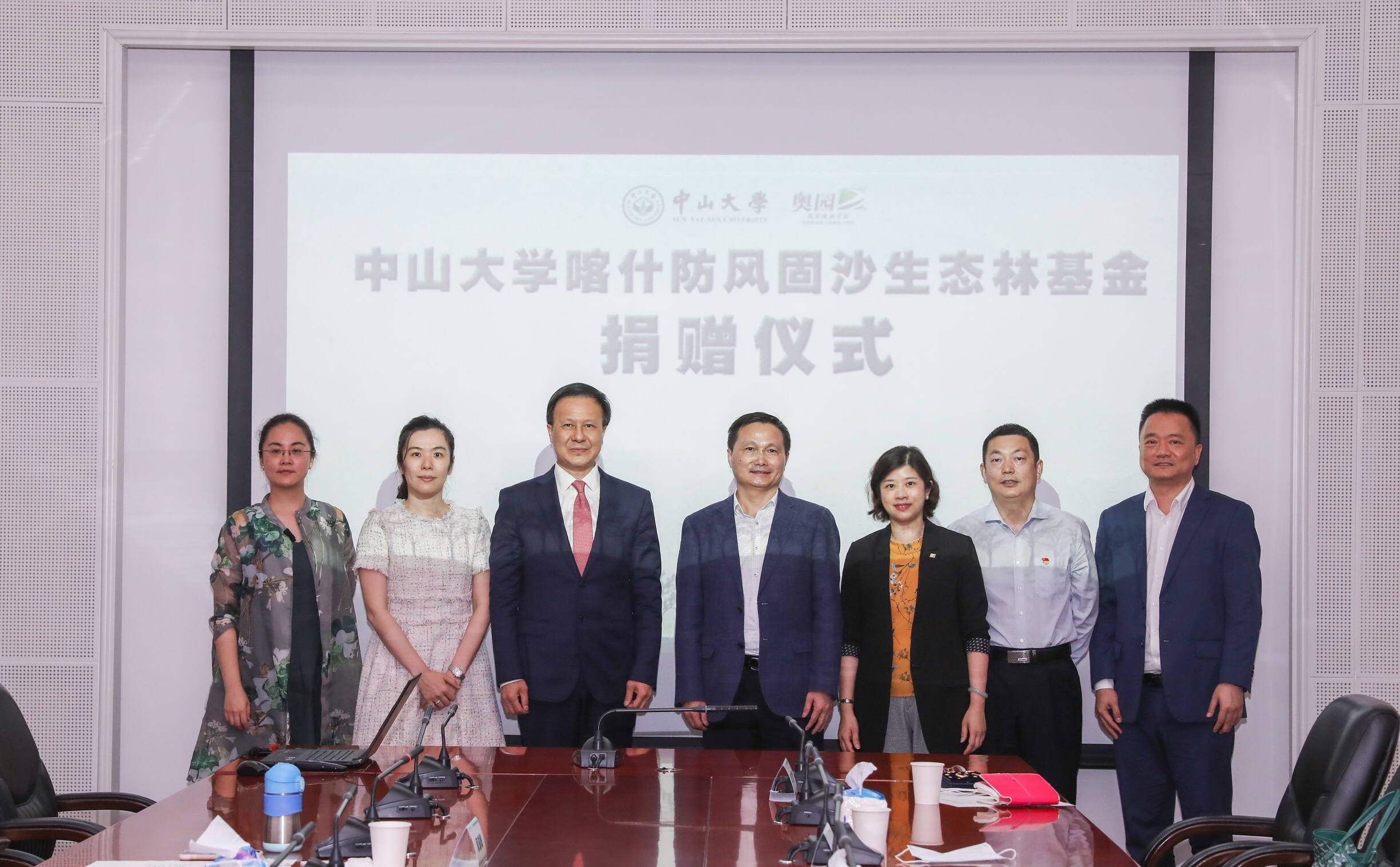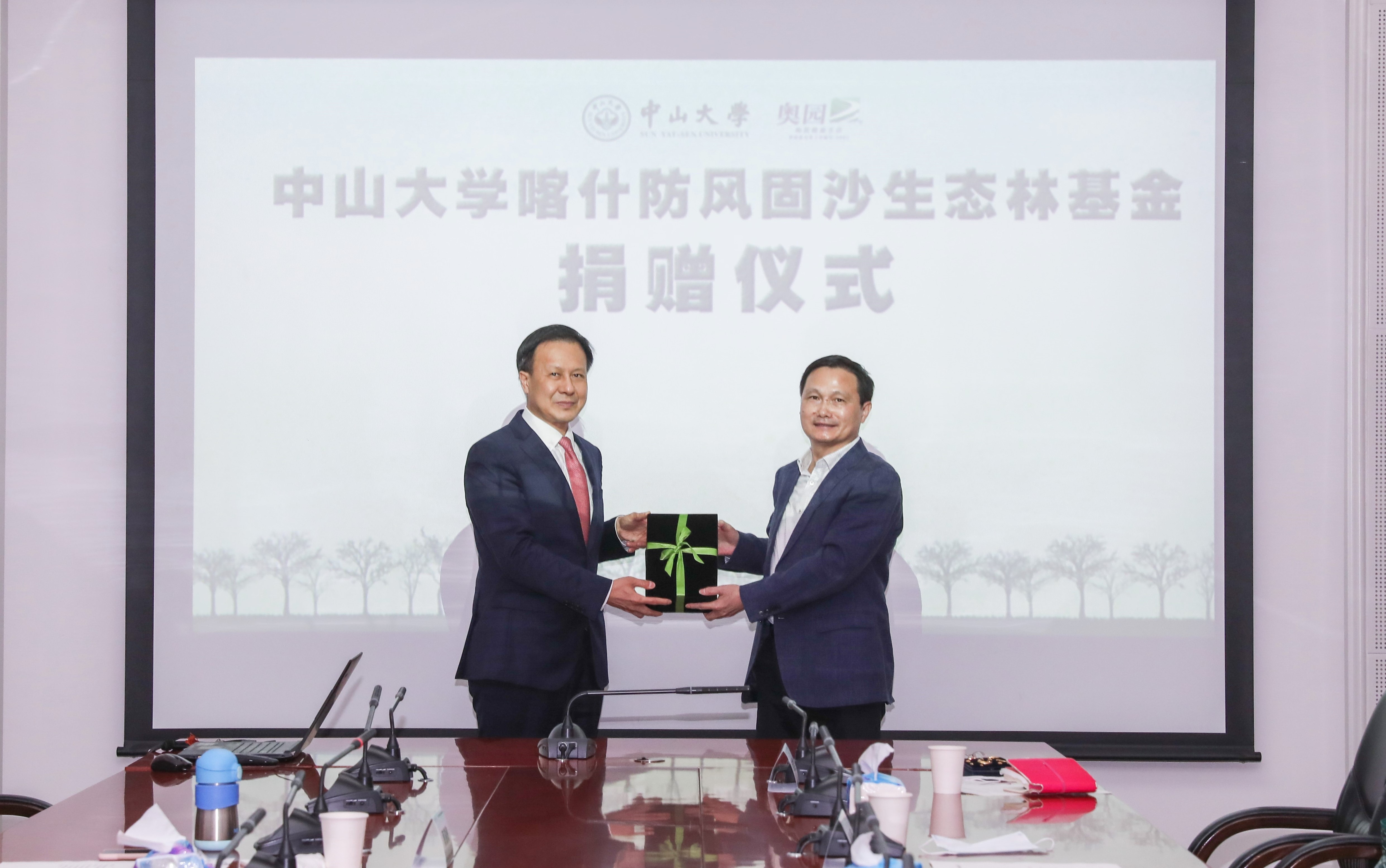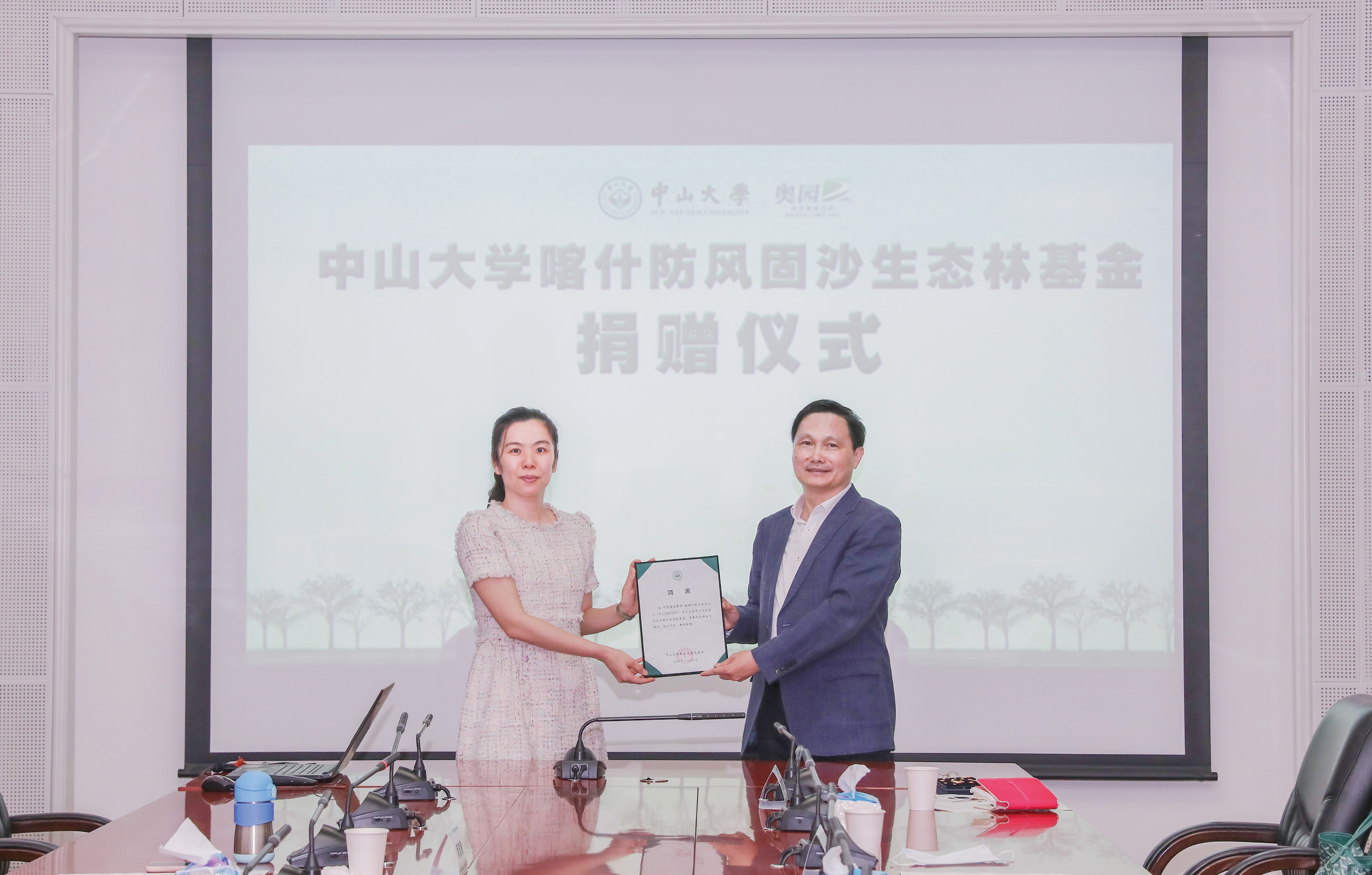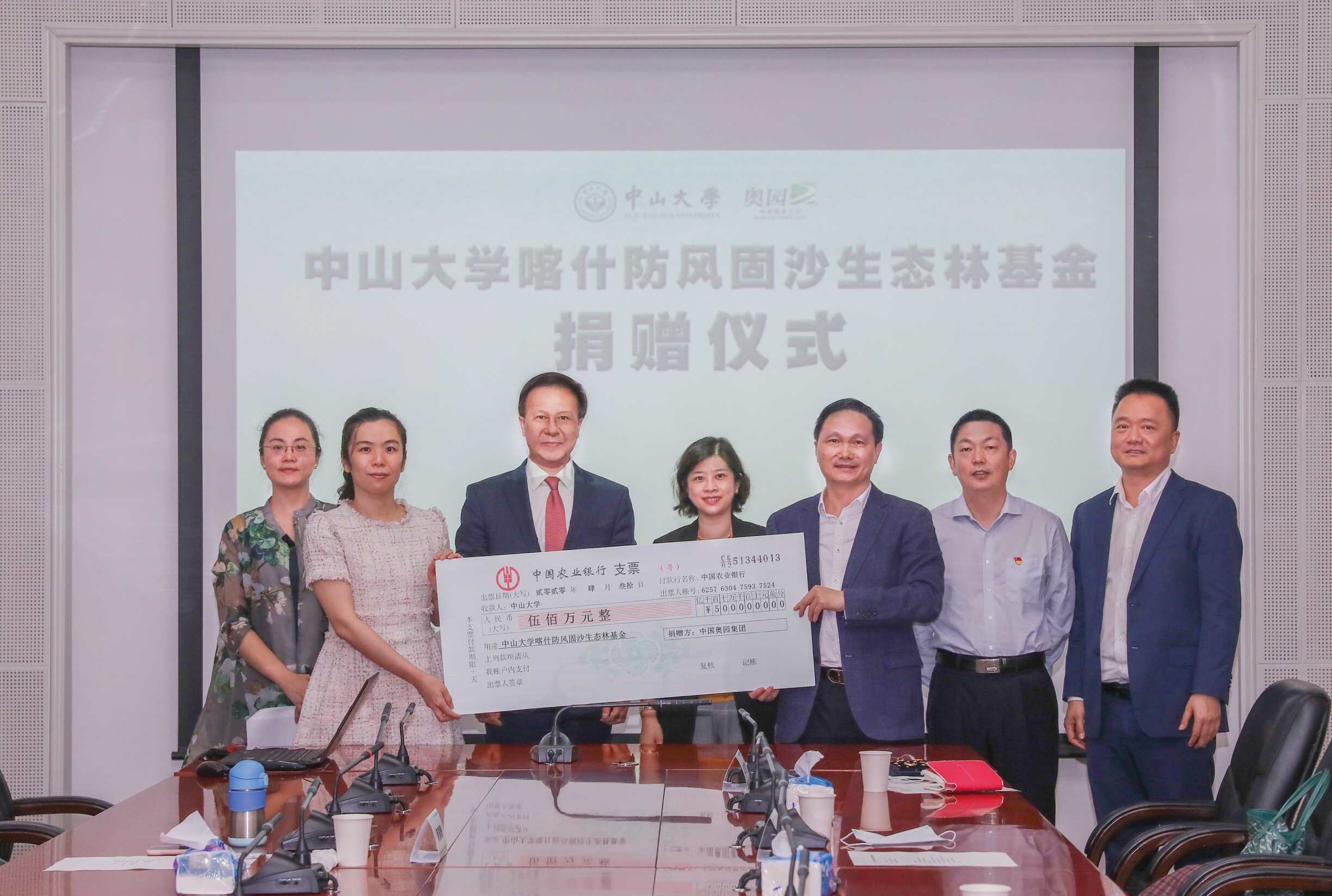 4月30日,中山大學(xué)喀什防風(fēng)固沙生態(tài)林基金捐贈儀式在中山大學(xué)梁銶琚堂舉行。中國奧園集團(tuán)黨委書記、總裁郭梓寧代表中國奧園向中山大學(xué)副校長、中大教育發(fā)展基金會副理事長肖海鵬教授轉(zhuǎn)交500萬元捐贈支票,專項(xiàng)用于促進(jìn)新疆喀什地區(qū)沙洲綠化、生態(tài)產(chǎn)業(yè)扶貧等,助力實(shí)現(xiàn)生態(tài)改善和脫貧攻堅(jiān)雙贏目標(biāo)。