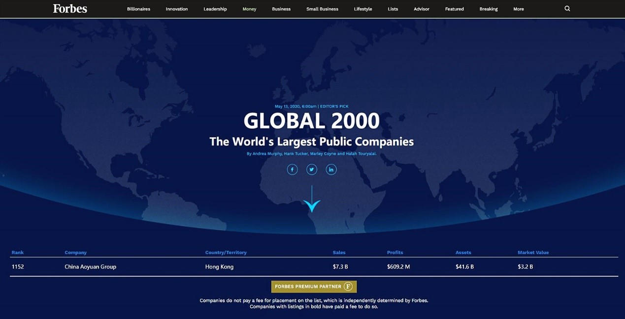 5月13日,全球最具影響力的權(quán)威商業(yè)雜志之一——《福布斯》發(fā)布2020年上市公司2000強(qiáng)榜單。其中,中國(guó)奧園(3883.HK)以73億美元銷售額、6.092億美元利潤(rùn)、416億美元總資產(chǎn)和32億美元市值首次躋身榜單,位列1152名。