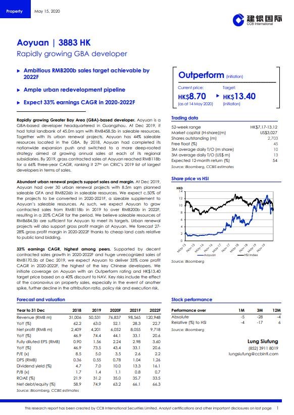 在研報中,建銀國際表示中國奧園為快速增長的大灣區(qū)發(fā)展商,已完成全國化布局,持續(xù)深耕重點區(qū)域,提高各區(qū)域的銷售金額,預(yù)期2022年合同銷售進(jìn)入2,000億規(guī)模,2019至2022年復(fù)合增長率約20%。建銀國際認(rèn)為,截至2019年底中國奧園的已售未結(jié)收入為人民幣1,705億元,2020至2022年核心盈利年復(fù)合增長率達(dá)33%,為同行最高。同時,中國奧園還擁有豐富城市更新項目資源,預(yù)計50%城市更新項目將于2020至2021年轉(zhuǎn)化土地儲備,補(bǔ)充可售資源,并認(rèn)為城市更新項目會為中國奧園帶來更高利潤率。