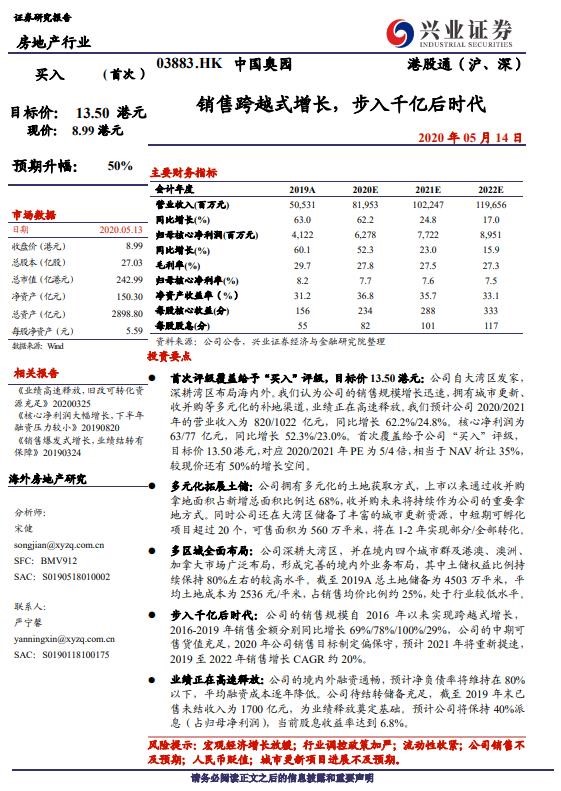 5月14日-15日,知名大行興業(yè)證券和建銀國際陸續(xù)發(fā)布研報首次覆蓋中國奧園集團(tuán)股份有限公司(股票代號:3883),予以“買入”評級,分別設(shè)定目標(biāo)價為13.5和13.4港元。