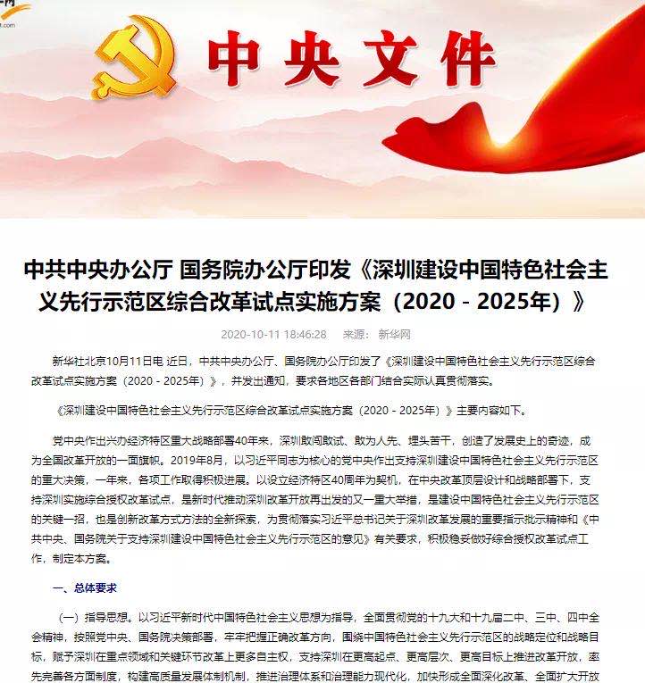 10月11日,中共中央辦公廳、國(guó)務(wù)院辦公廳印發(fā)了《深圳建設(shè)中國(guó)特色社會(huì)主義先行示范區(qū)綜合改革試點(diǎn)實(shí)施方案(2020-2025年)》(下稱《方案》),賦予深圳在重點(diǎn)領(lǐng)域和關(guān)鍵環(huán)節(jié)改革上更多自主權(quán),有力推進(jìn)深圳的改革開放事業(yè)。