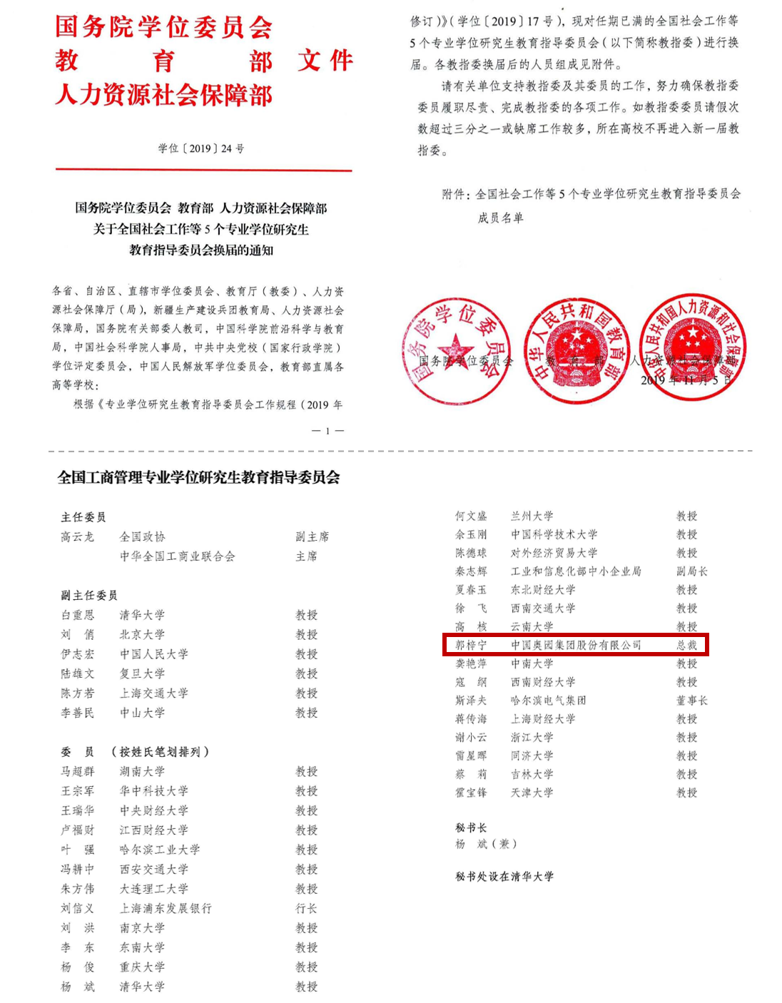 據國務院學位委員會、教育部、人力資源社會保障部2019年11月聯合印發(fā)的《國務院學位委員會 教育部 人力資源社會保障部關于全國社會工作等5個專業(yè)學位研究生教育指導委員會換屆的通知》(學位〔2019〕24號)顯示,第六屆全國MBA教指委有主任委員1人,由全國政協副主席、中華全國工商業(yè)聯合會主席高云龍擔任,副主任委員6人,委員28人。鑒于突出的學術成就與教育貢獻,郭梓寧總裁被選聘為第六屆全國MBA教指委委員,成為國內唯一上榜的民營企業(yè)家委員。