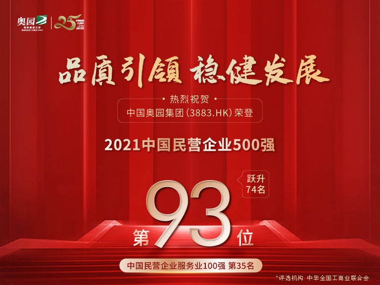 同日,全國工商聯(lián)正式發(fā)布2021年“中國民營企業(yè)500強”和“中國民營企業(yè)服務(wù)業(yè)100強”榜單。中國奧園躍居“2021年中國民營企業(yè)500強”第93名,排名較2020年勁升74位,連續(xù)四年上榜。同時,中國奧園還榮登“中國民營企業(yè)服務(wù)業(yè)100強”第35名。