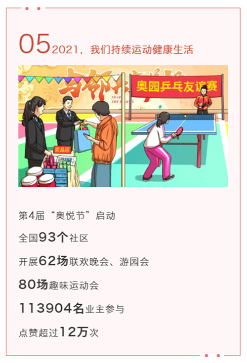 本屆奧悅節(jié)為期3個多月,覆蓋27座城市、93個社區(qū),通過舉辦聯(lián)歡晚會、健康運動會、尊老敬老等活動服務業(yè)主,用實際行動兌現(xiàn)“構筑健康生活”的品牌理念。