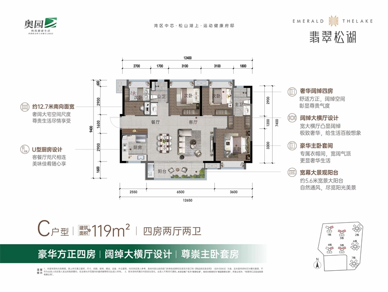 為滿足客戶暢享全景四季鮮氧生活需求,翡翠松湖在戶型上極力打造寬幕尺度。其中,建面119㎡的4房2廳2衛(wèi),擁有約12.7米南向面寬,約7米寬境大橫廳,讓業(yè)主無論是居家還是接待客人均顯氣派。另外,該戶型約5.6米寬境陽(yáng)臺(tái)與客廳相連貫通,盡享無界景觀視野。太太的瑜伽,孩子的露營(yíng)帳篷,父母的花草,生活點(diǎn)滴輕松容納。