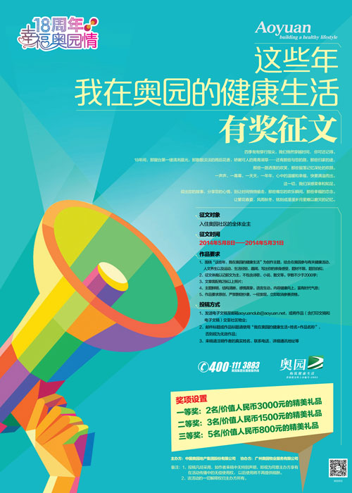 征文活動(dòng)征集時(shí)間為2014年5月8日至5月31日,征文對象為奧園全體業(yè)主。征文作品要求圍繞“這些年,我在奧園的健康生活”為創(chuàng)作主題,結(jié)合在奧園參與有關(guān)健康活動(dòng)、人文養(yǎng)生及運(yùn)動(dòng)、生活經(jīng)驗(yàn)、趣聞,寫出業(yè)主的親身感受,題材不限,題目自擬。征文體裁以記敘文為主,不包含詩歌、小說、散文等。字?jǐn)?shù)不少于2000字。5月31日前,只要是奧園業(yè)主,發(fā)送電子文稿至郵箱aoyuanclub@aoyuan.net,或?qū)⒆髌罚ê蛴∥母搴碗娮游母澹┙恢辽鐓^(qū)物業(yè),都有機(jī)會(huì)獲得3000元的獎(jiǎng)金。大賽終評結(jié)果將于6月31日之前公布。
