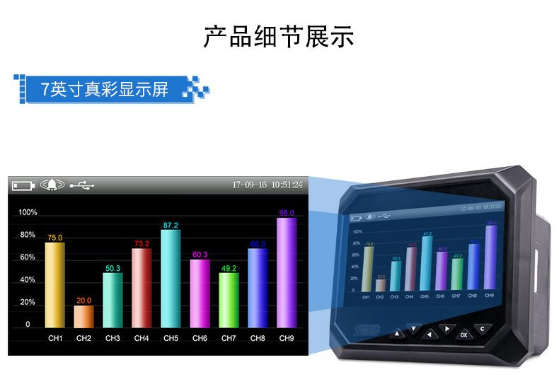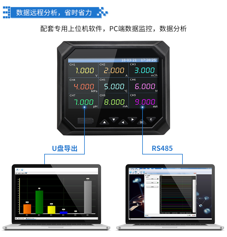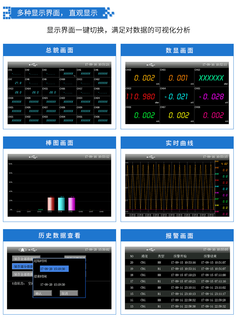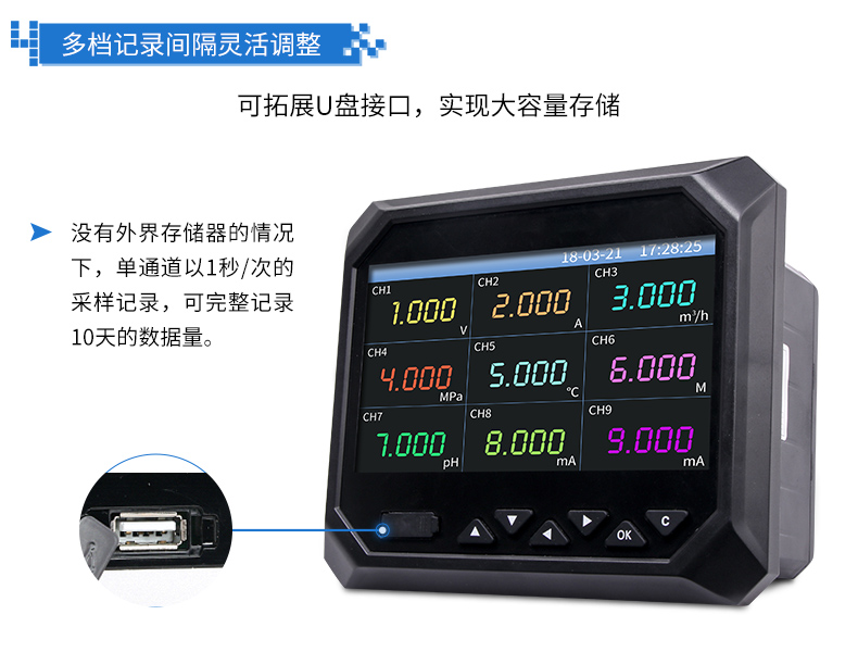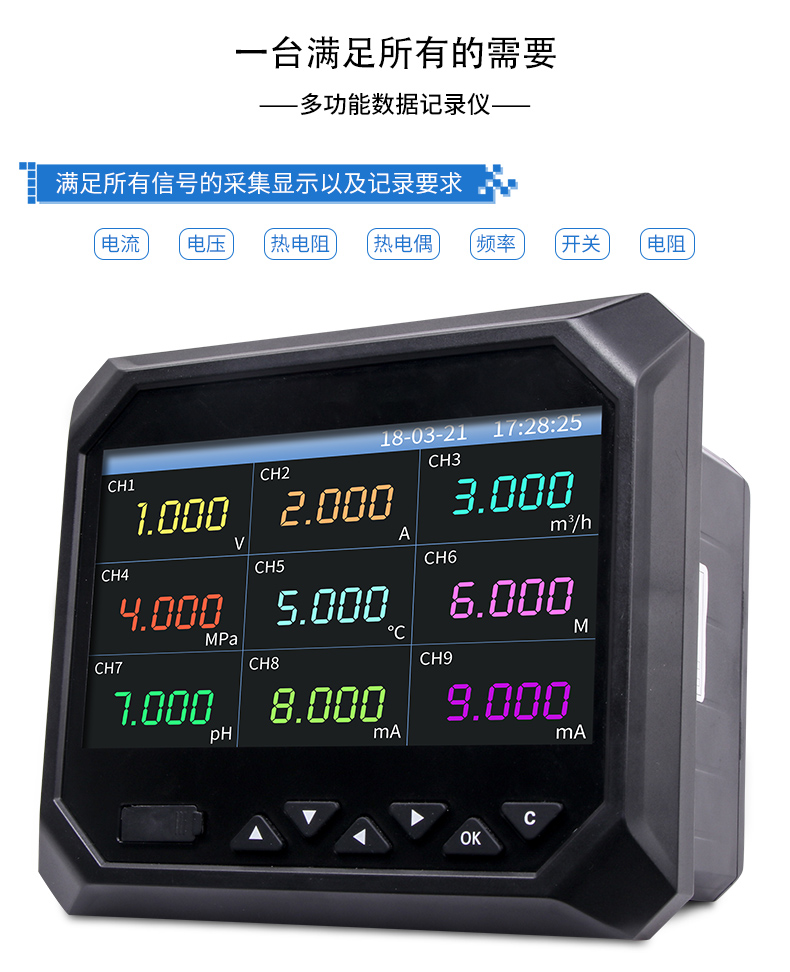 無紙記錄儀是將工業現場的各種需要監視記錄的輸入信號,比如熱電阻和熱電偶的溫度信號、流量計的流量信號、 壓力變送器的壓力信號等。通過高性能微處理器進行數據處理,一方面在高分辨液晶顯示屏幕上以多種形式的畫面顯 示出來,另一方面把這些監察信號的數據存放在儀表內部的大容量存儲芯片內,以便在儀表上直接進行數據和圖形查 詢、翻閱和打印。CN5
